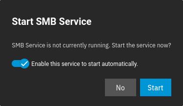 Anschließend wird festgelegt, dass der Samba (SMB) Dienst automatisch gestartet werden soll (enable) und das auch jetzt bereits getan werden soll -> Start.