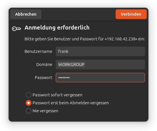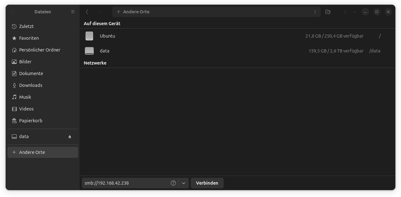 Von einem anderen Linux-Rechner im Netzwerk verbinde ich mich zum TrueNAS und gebe dabei das dafür vorgesehene Protokoll (smb) an: smb://192.168.42.238