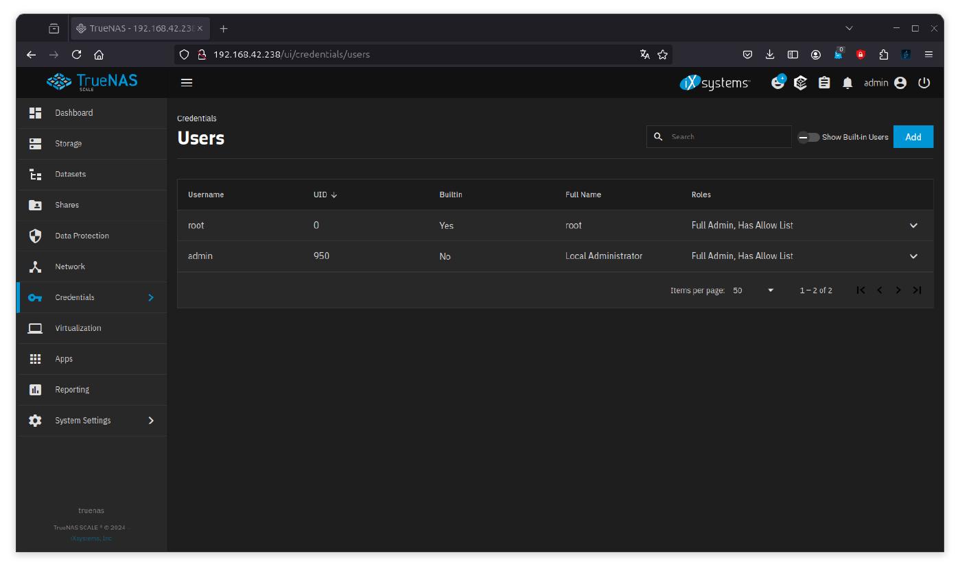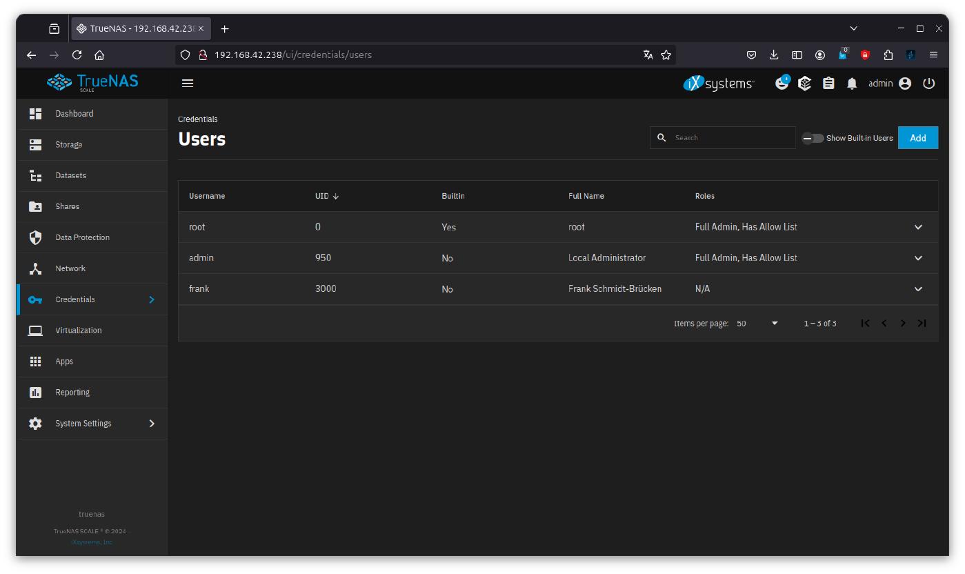 Die TrueNAS-Benutzerverwaltung ist über -> Credentials -> Local User zu erreichen.