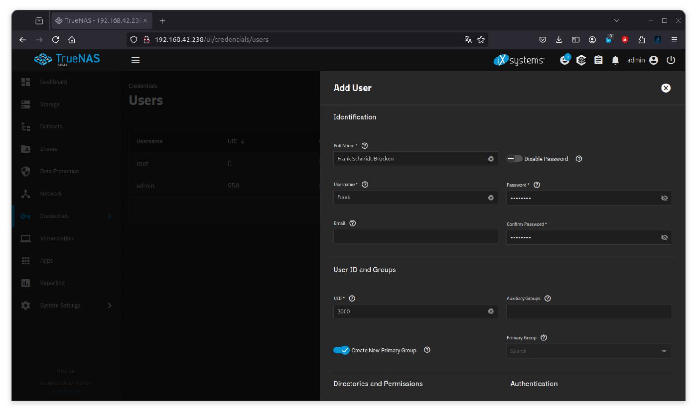 Dem TrueNAS-Prozess folgend, benötigt eine Samba-Freigabe bei der Erstellung zumindest einen Benutzer. Dann wollen wir mal…