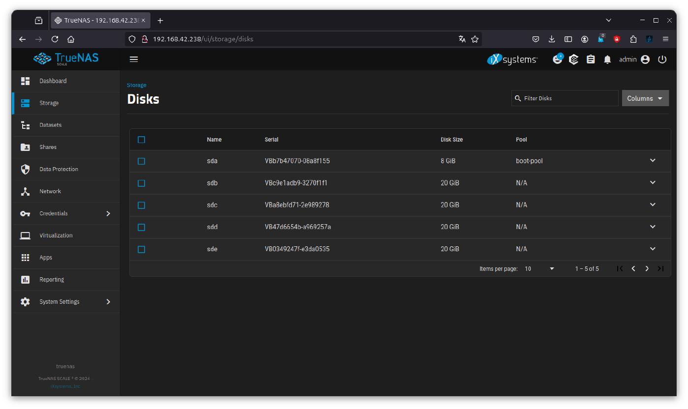 Click -> Storage -> Disks to display the list of hard disks recognised in the system. There should now be some disks here that are not yet assigned to a pool (N/A)