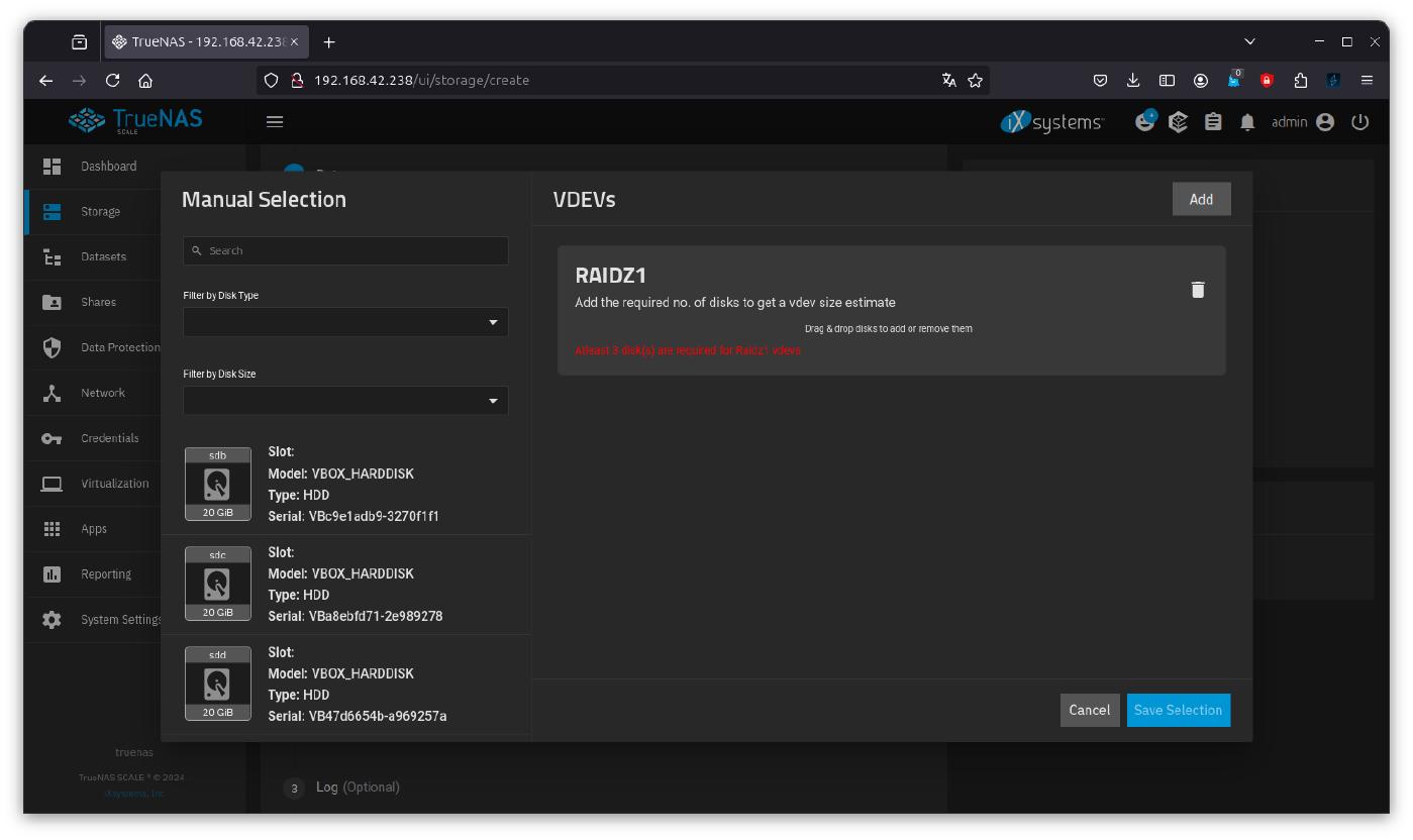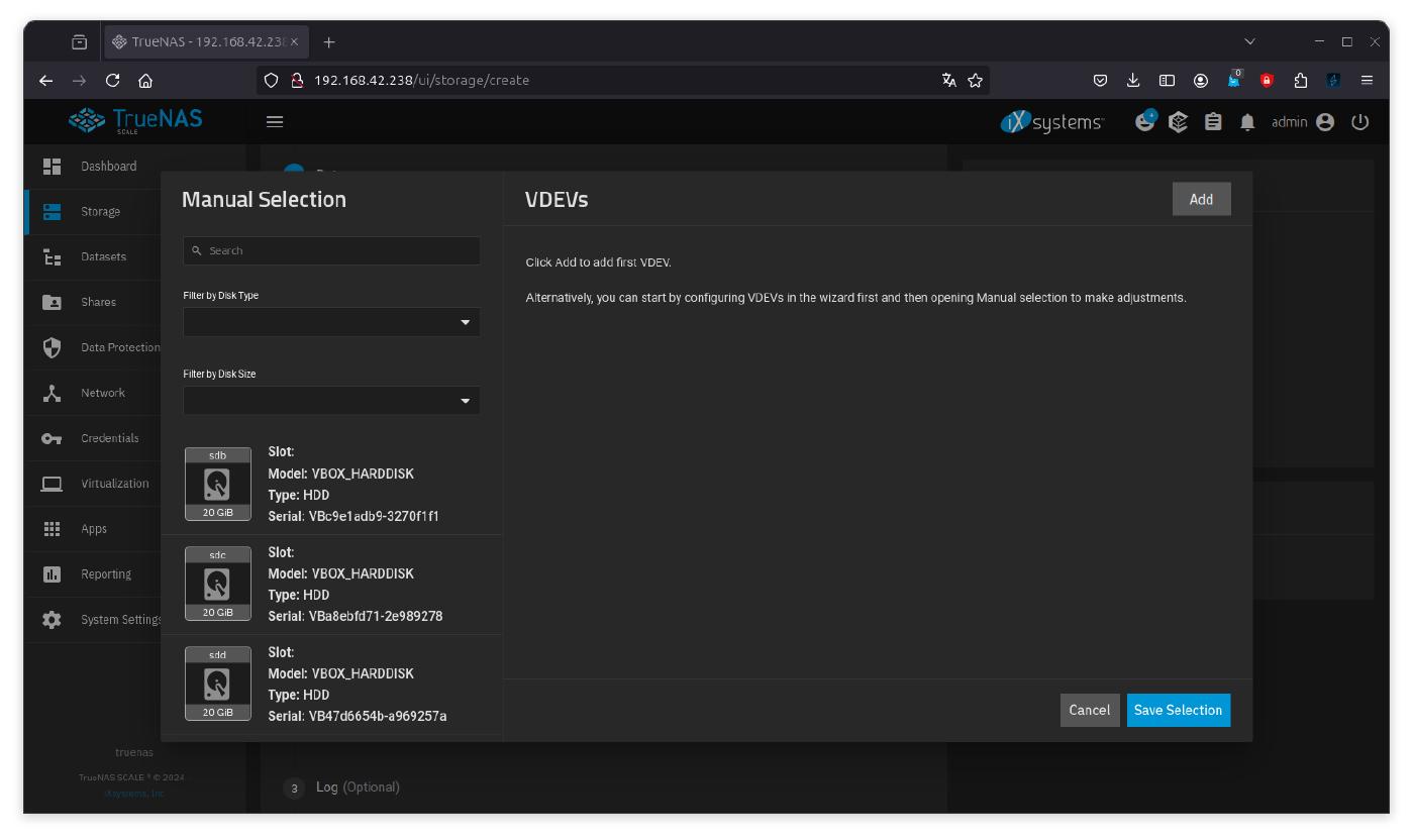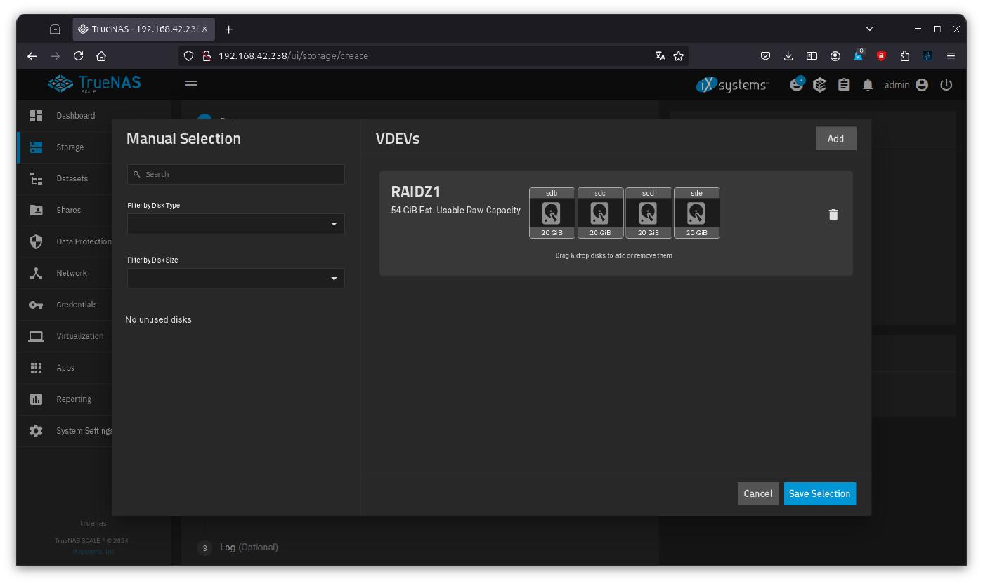 1 GBit networks due to the cheap components, which can therefore move data at around 100 MB/s. In this context, it makes perfect sense to favour the higher usable capacity of a RAID-Z1 or RAID-Z2 over the higher speed of a RAID-1 layout.ZFS L2ARC read cache is added to the system. (see below definition of the pool layout, optional cache)From TrueNAS main dashboard you can access the storage management area via -> Storage.
