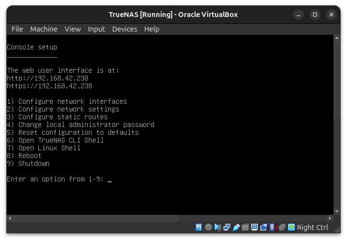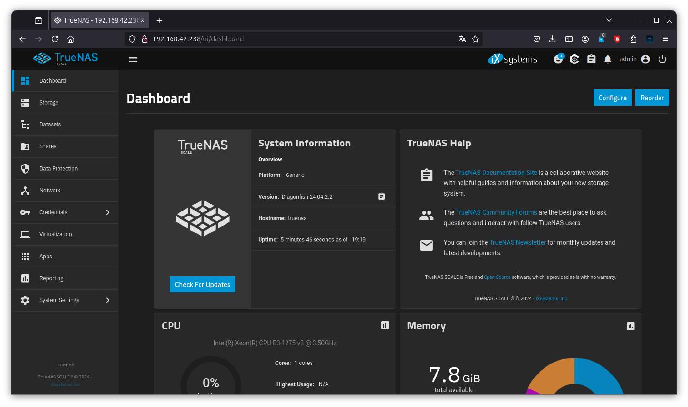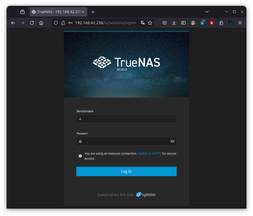 Here you will also find the address at which the TrueNAS WebGUI can be accessed. In my case, .238 was obtained from the DHCP server: http://192.168.42.238. This is likely different on your side.