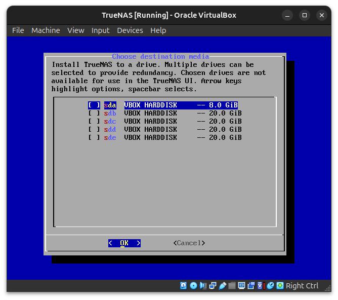 In this case, we see five hard disks virtualised by VirtualBox, an 8GB hard disk that is intended for the TrueNAS operating system and four other 20GB hard disks that we will later merge into a data pool.