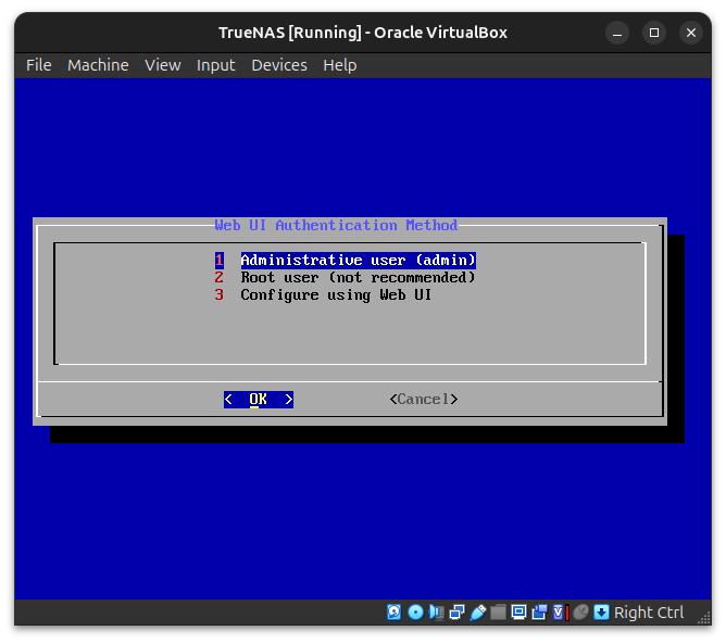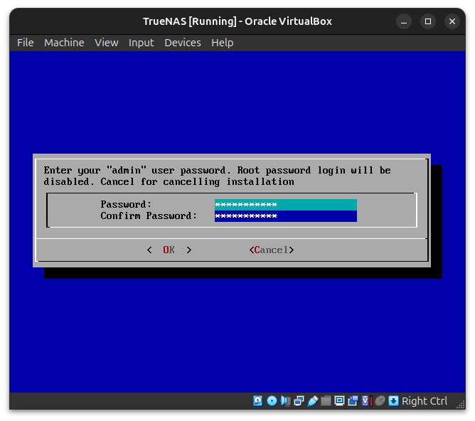 Next, we create the Admin access for this TrueNAS installation by selecting 1