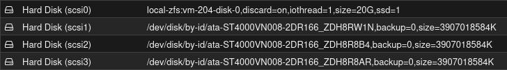 Proxmox keeps a list of the hard disks of each virtual machine. In this case, select the VM of the TrueNAS Backup-NAS, then Hardware and look at the list of hard disks that Proxmox uses for this VM. scsi:0 is the virtualised system hard disk and scsi:1 - scsi:3 are the RAID array hard disks.
