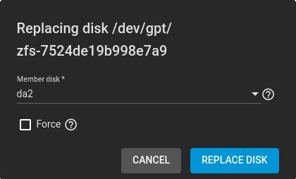 In the dialogue that appears, the hard disk that is to be used for the vacant position in the pool is selected. The list only contains a selection of hard disks that TrueNAS has recognised but not yet assigned to a pool. If you wish, you can force the deletion of the disc by ticking the ‘Force’ box.