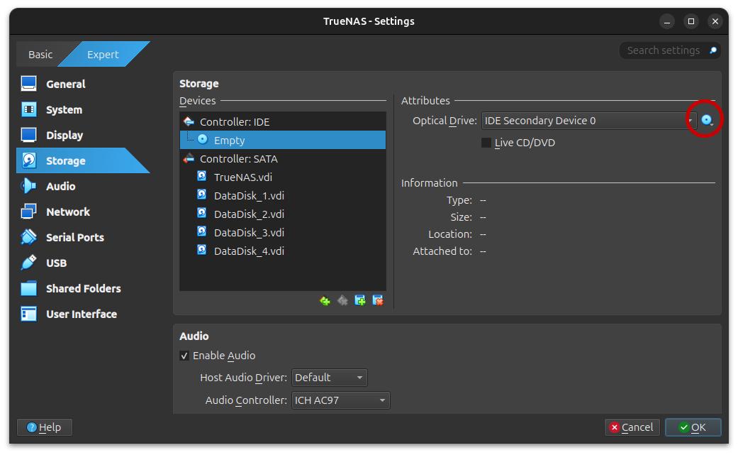 Select the empty DVD drive on the IDE controller and open the corresponding dialogue (see red circle in the screenshot)